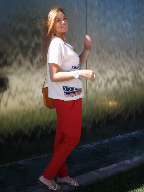 Éste look es muy bohemio, me gusta sobre todo por el contraste de colores que tiene el jersey y como queda con éste pantalón que he elegido ya que el rojo es un color muy vivo, te saca de muchos apuros y pega con todo.